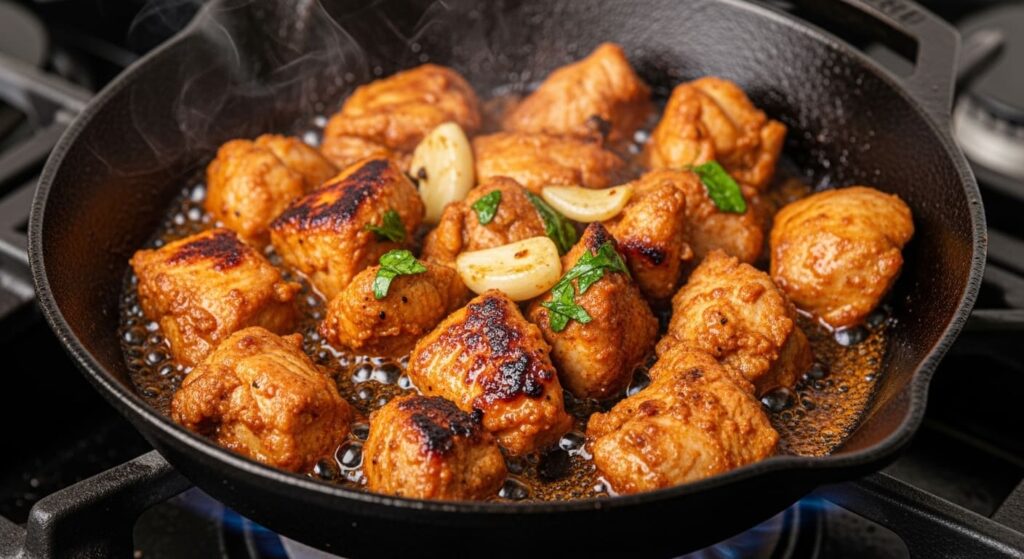 Cook the chicken on the stove in a non-stick pan or, even better, on a BBQ, until it’s deep golden brown with slightly charred edges. No need to add oil—the marinade provides plenty. Use medium-high heat so the outside browns without the inside overcooking.