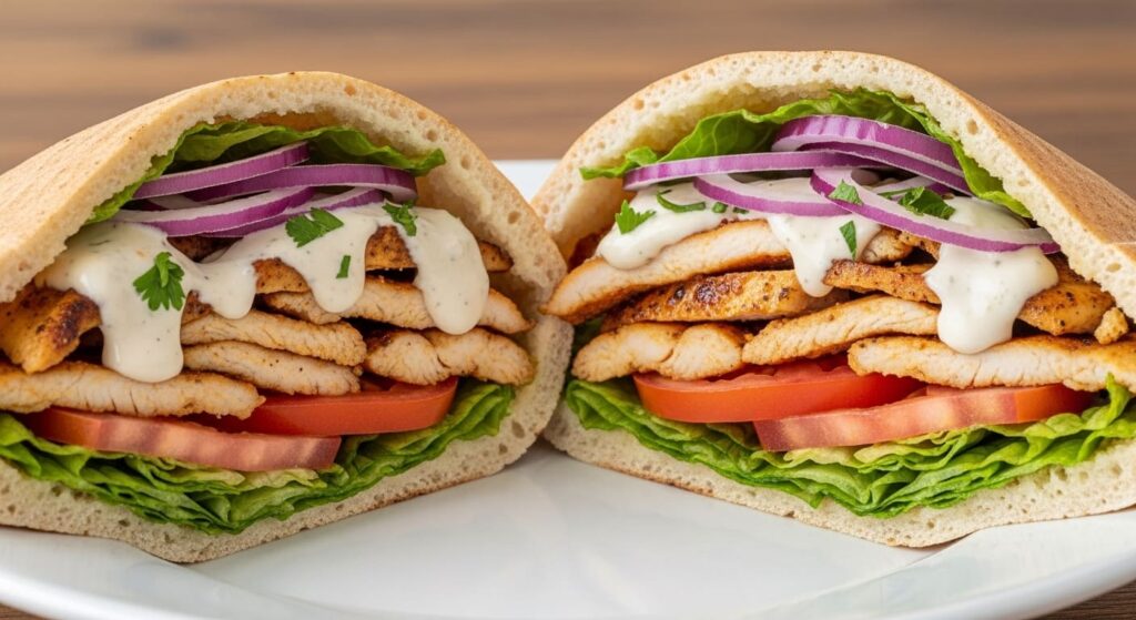 2. Assemble the gyros – Spread sauce down the center of the pita. Layer on the chicken, then add lettuce and tomato along the sides. Sprinkle with red onion, top with hot chips if using, and drizzle with extra sauce. Fold, wrap, and enjoy!