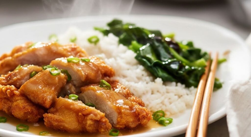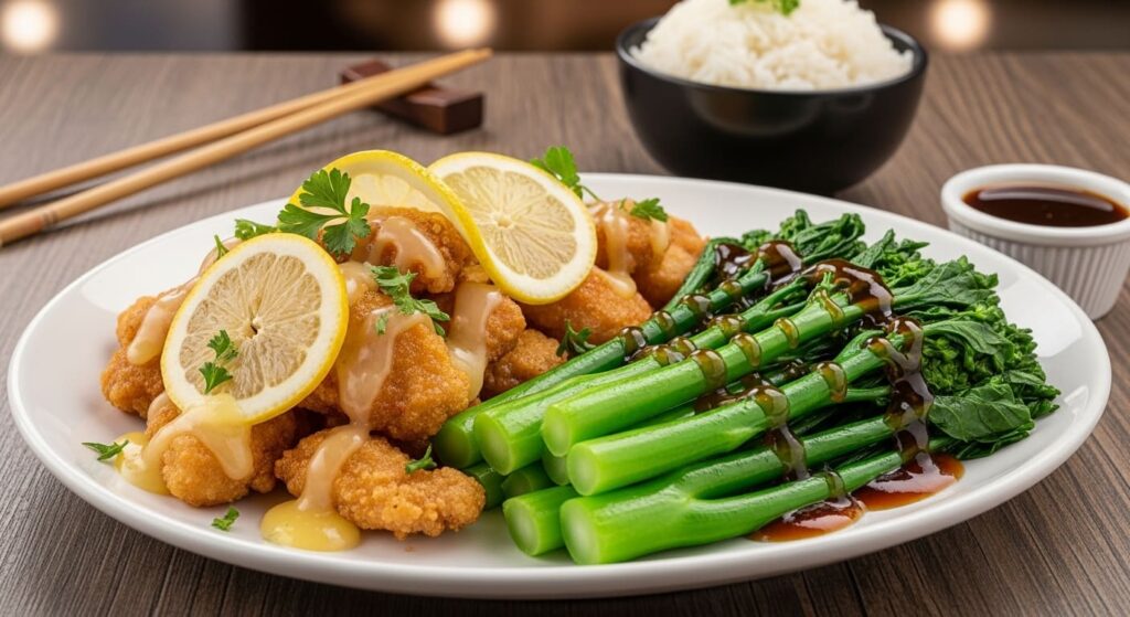 I served the chicken with Chinese broccoli and oyster sauce—the classic Yum Cha-style combo—and plain steamed rice, which is perfect for soaking up every drop of that zesty lemon sauce. Of course, you could easily upgrade to fried rice or even buttery garlic rice (how did I not think of garlic rice sooner?!).