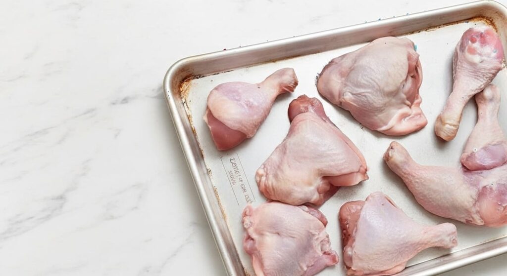 Season the chicken generously with salt and pepper. Heat oil in a pan and sear the pieces until the skin is nicely browned, then transfer them to a tray. For thighs, cook skin-side down for about 4–5 minutes, then flip and cook the flesh side for just 1 minute to seal. With drumsticks, brown as many sides as you can—about 2 minutes per side works well.
